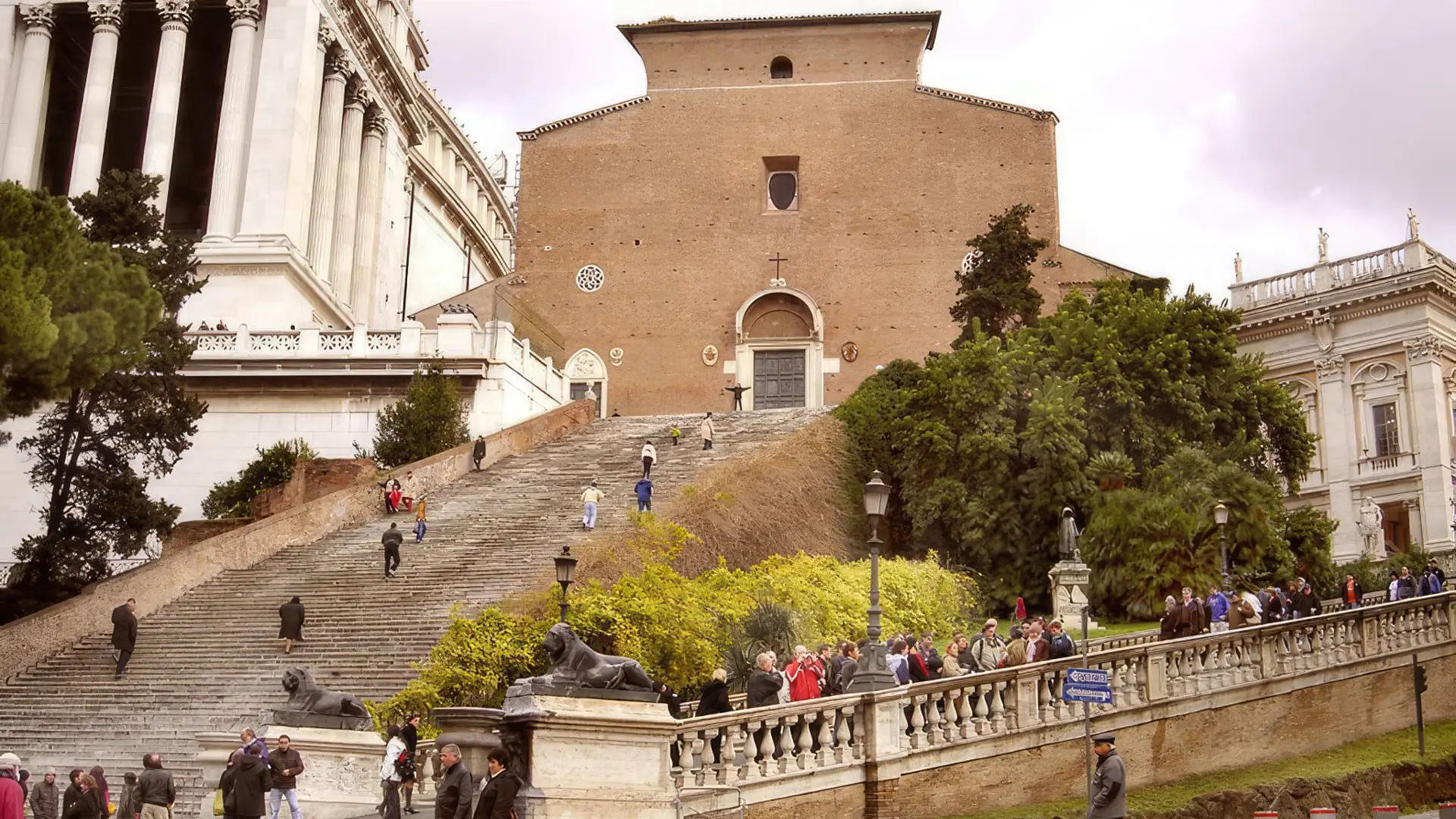 - Де: Між Вітторіано і Капітолійськими музеями, на верхівці крутих сходів («майже 100 сходинок»).