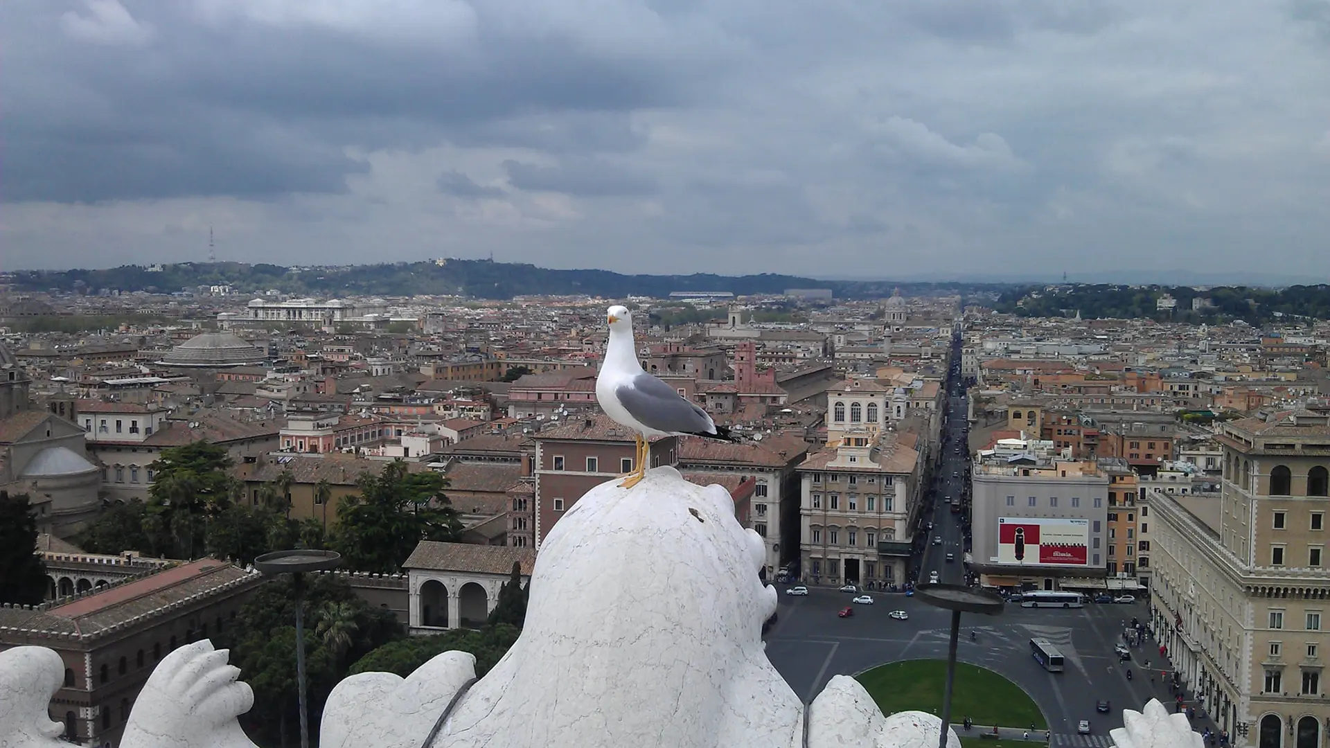 - Ще один вітторіанівський дах дуже рекомендую. З одного боку ви побачите Римський Форум, а з іншого — вид на площу Венеції з двома майже симетричними палацами (з балкона лівого часто виступав Муссоліні, там був його кабінет) та вулицю Корсо. У першому будинку ліворуч, на початку Корсо, доживала свого віку Летиція Бонапарт, матір Наполеона. А трохи далі по Корсо «втратили» картину Караваджо «Успіння Марії».